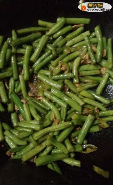 7尖椒炒软后,放入煮好的无丝豆和炒熟的瘦肉片一起炒。