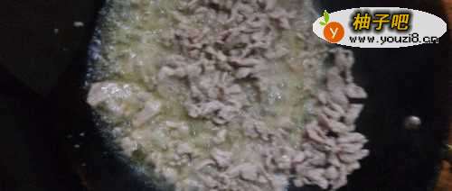 5热锅热油,放入瘦肉,快速翻炒。加适量的盐,炒熟后铲出。