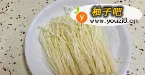 2把金针菇尾部切掉洗净,然后和泡软的粉丝摆盘,等着后面的步骤用